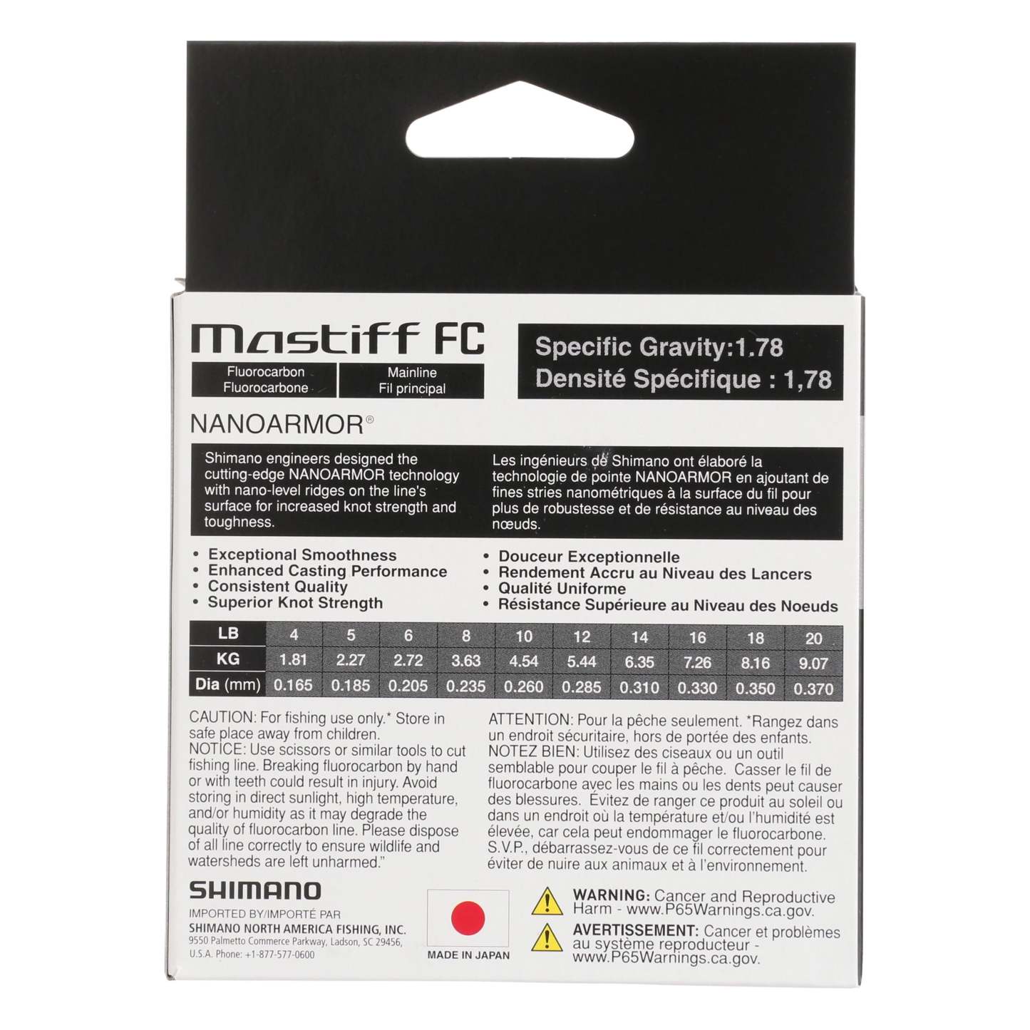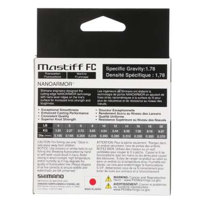 Shimano Mastiff Fluorocarbon Line, formulated in Japan with stringent product control, is a 100% fluorocarbon that provides anglers with consistency, dependability, and strength. Not only does it exhibit increased smoothness and suppleness, but also boasts NANOARMOR® technology, a special construction with nano-size ridges that strengthen knots and increase line toughness.